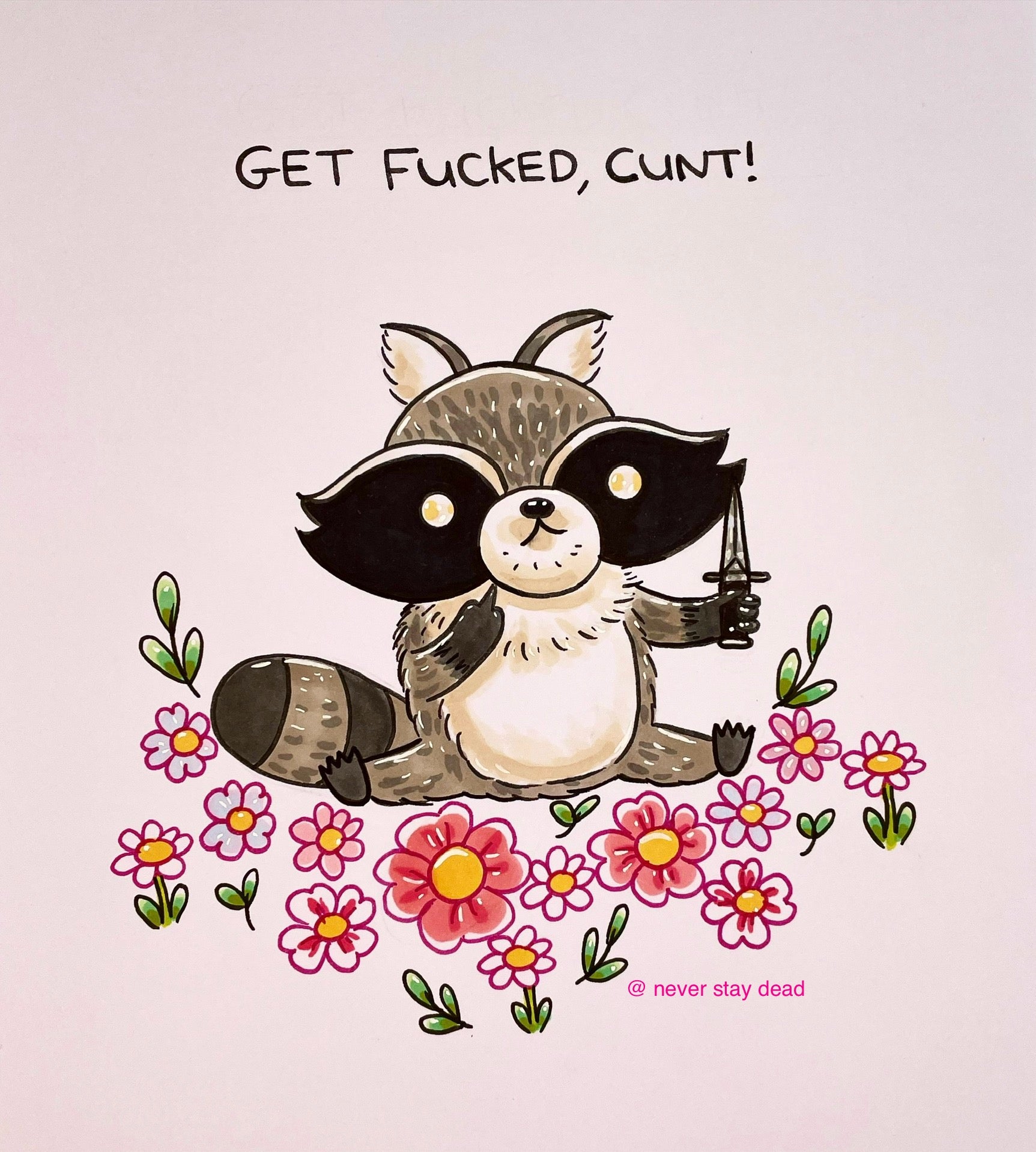 Mini Original ‘Get Fโฆ Raccoon’ Drawing (A5) โ Never Stay Dead